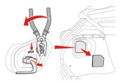 Accesso all'attrezzatura La pinzetta d'estrazione è fissata sul retro del coperchio delle scatole fusibili del cruscotto. Sganciare il coperchio tirando la parte superiore sinistra, poi ...